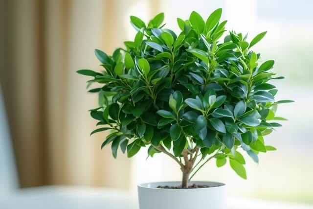Woody-stemmed indoor trees like fiddle leaf fig and rubber plant.