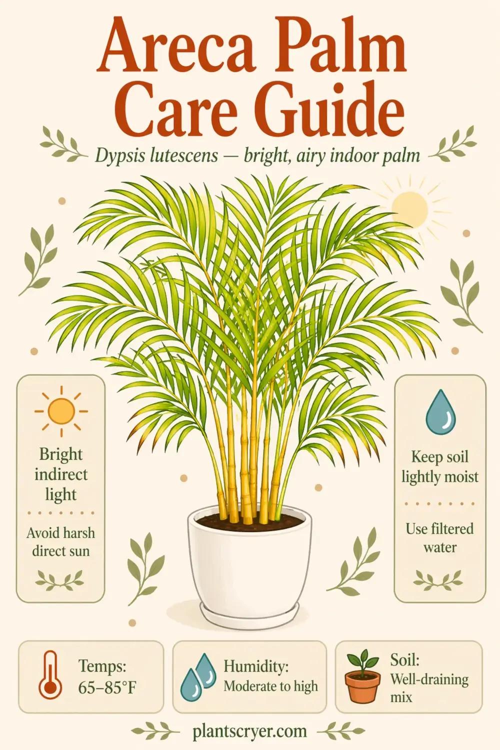 60 to 80°F (16 to 27°C). Avoid temperatures below 50°F, which cause cold damage to the fronds. Keep away from cold drafts, exterior doors, and single-pane windows in winter. Areca palm tolerates warm temperatures well but dislikes sudden temperature swings, which can trigger frond yellowing.