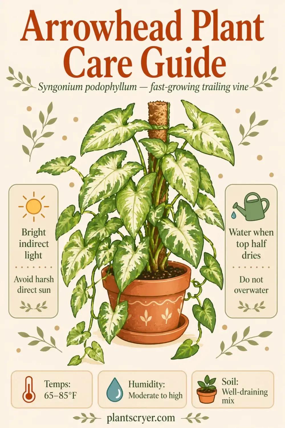 Brown leaf edges Low humidity. Arrowhead plant prefers 50 to 60% humidity. Dry indoor air in winter causes crispy brown margins. A humidifier fixes this more effectively than misting.