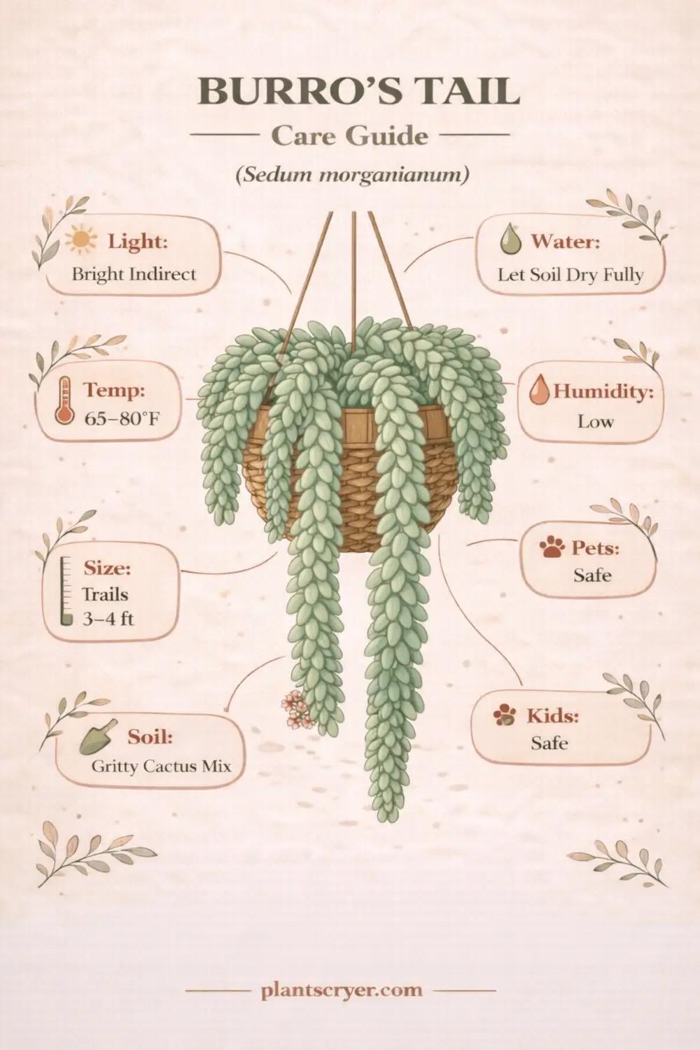 What most nurseries sell as "Burro's Tail" is typically S. burrito — it ships more reliably because fewer leaves fall in transit. If your plant has noticeably rounder leaves, you likely have 'Burrito.' Care is identical for both.
