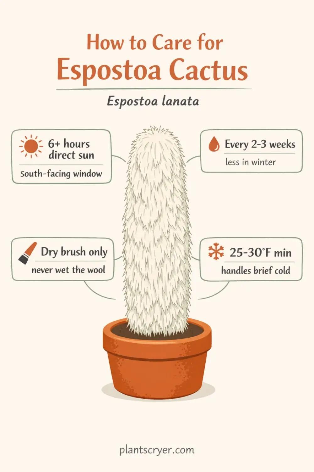 Espostoa lanata grows at high altitude in the Andes and handles temperature swings better than most cacti. It's comfortable between 65 and 85°F indoors and tolerates brief dips to around 25 to 30°F in dry conditions. Sustained frost or prolonged cold will damage it. Keep it away from cold drafts, cold window glass in winter, and air conditioning vents. The combination of cold and wet is what kills it — cold alone it can handle briefly.