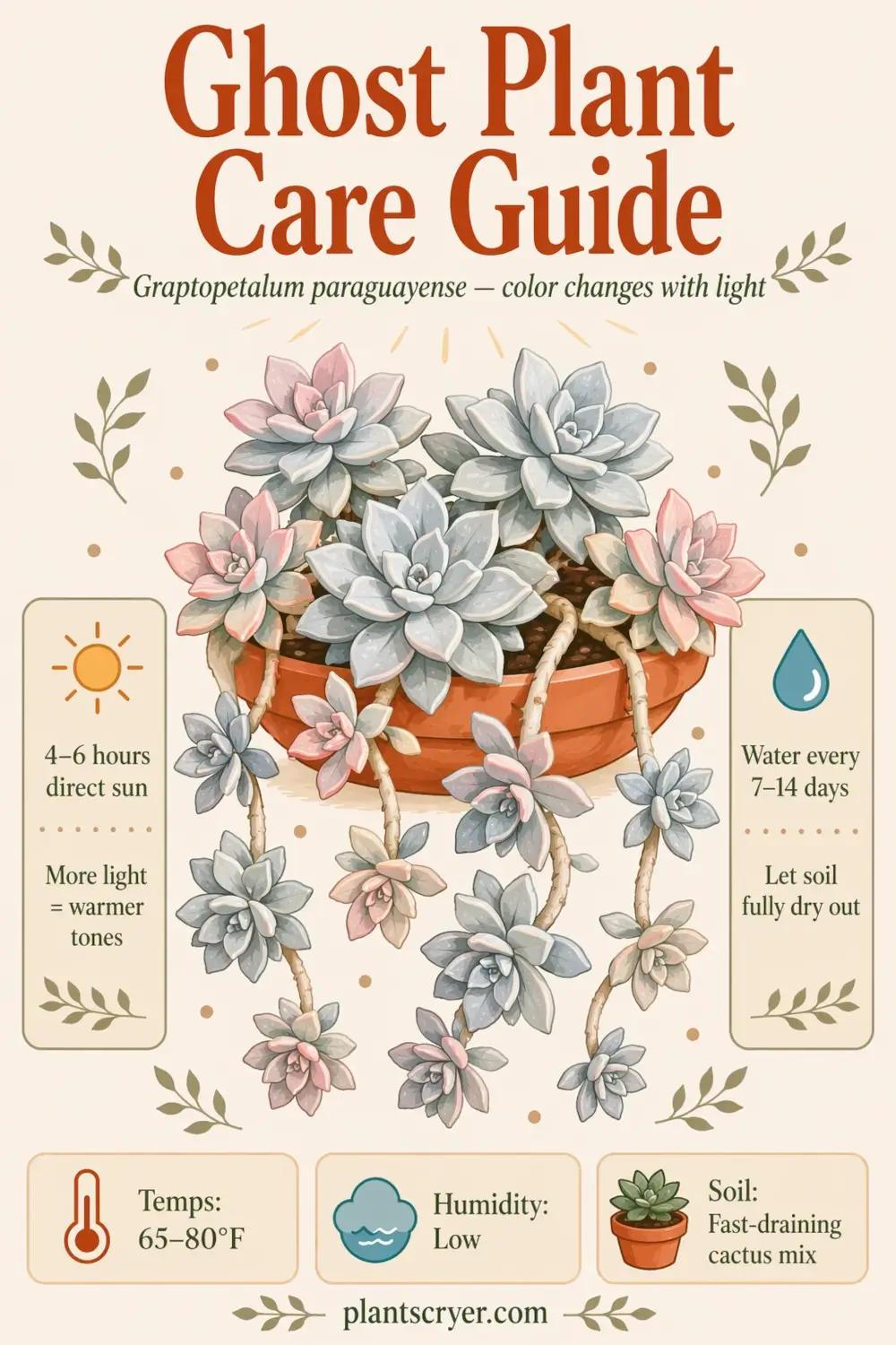SaveGhost plant (Graptopetalum paraguayense) is a colour-shifting succulent that tells you exactly how much light it is getting. In bright direct sun, the rosettes flush pinkish-yellow. In partial shade, they turn pale blue-grey, almost translucent. The ghostly, washed-out appearance in lower light is where the common name comes from. If your plant looks grey, it wants more sun. If it looks pink, it is getting what it needs.