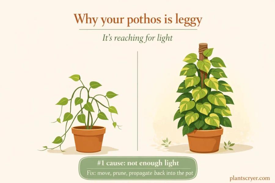 Before you reach for the scissors, look at where the leggy growth starts. If the entire plant is leggy from the pot outward, light is the cause. If it was full near the pot but thinned out further along the vines, you are looking at natural leaf drop from age or lack of pruning. That distinction tells you whether to move it or cut it back — or both.
