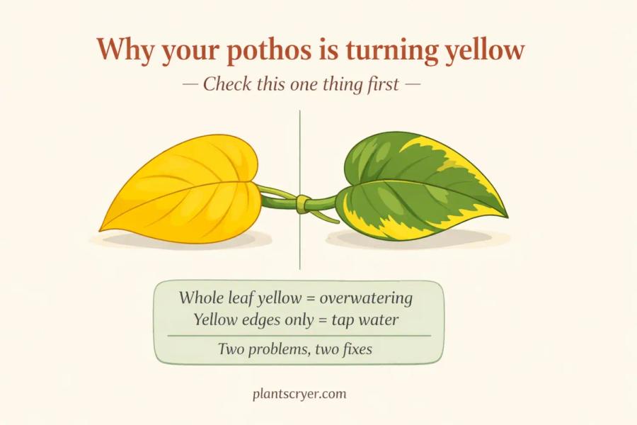 Yellow leaves on golden pothos are almost always a watering problem. Overwatering is the most common cause by a wide margin, because the plant needs far less water than most people give it. The roots sit in wet soil, lose oxygen, start to rot, and the first visible symptom is yellowing that works up from the lower leaves.