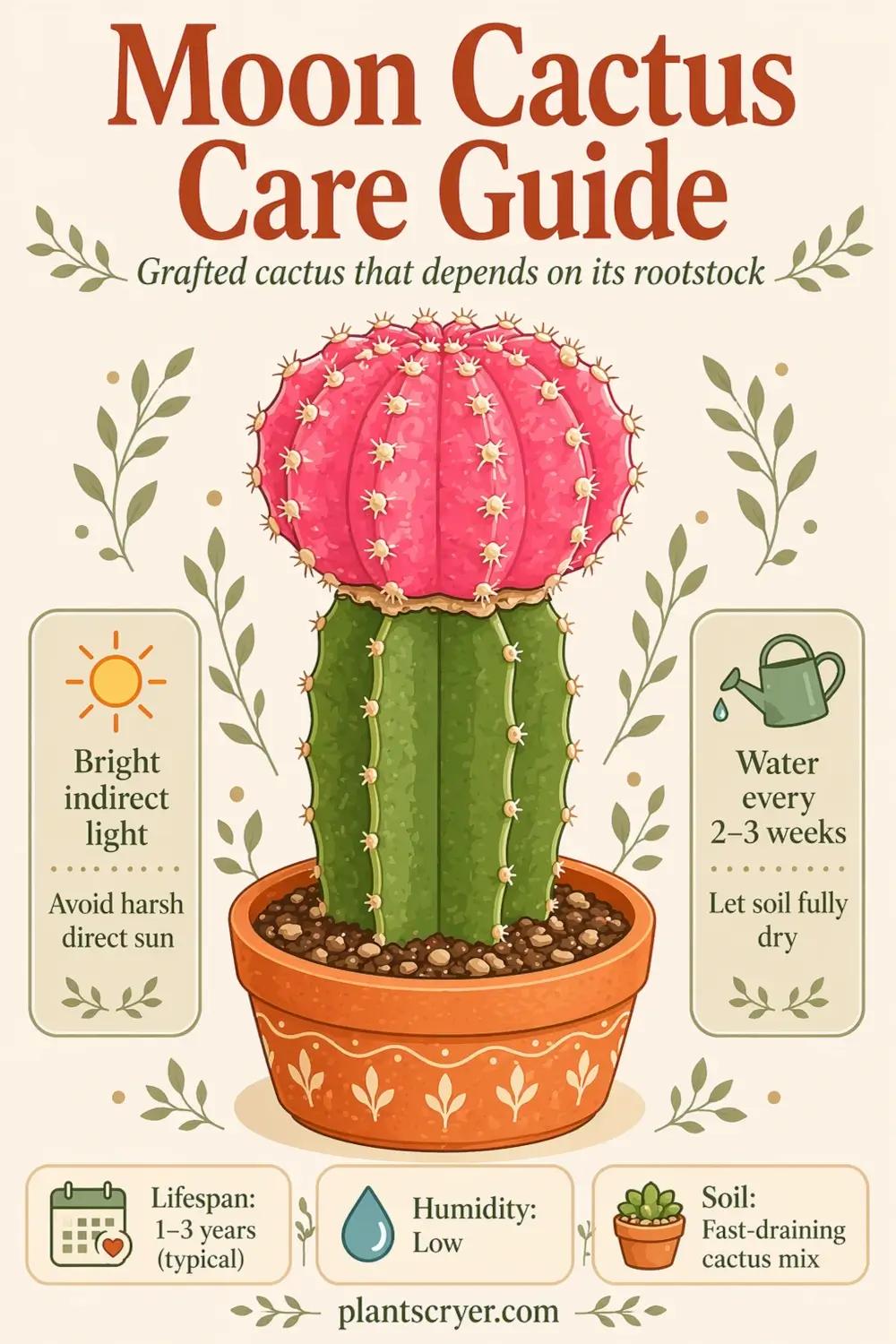 A grafted moon cactus typically lasts 1 to 3 years. The graft between the two cactus species eventually fails as they grow at different rates. You can extend the plant's life by regrafting the colourful top onto a fresh rootstock when the original base starts to yellow or soften. With regrafting, some specimens survive 5 years or more.